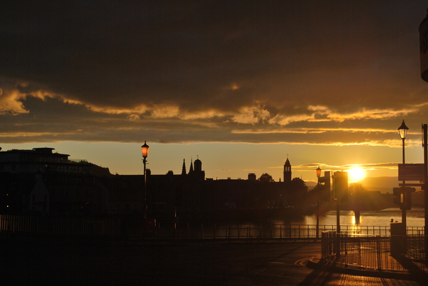 This picture shows orange streetlight at twilight on a peaceful evening with church spires and a clock tower in the background.