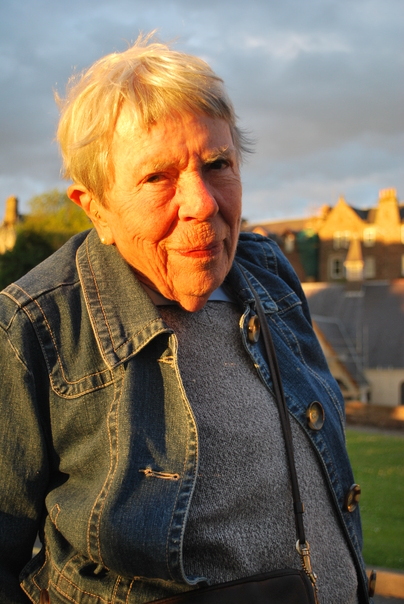 This is a wonderful picture of an older wise and thoughtful woman in a gray sweater and blue denim jacket with short gray hair.