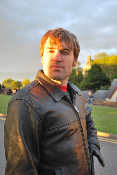 A man wearing a leather jacket squints as his stares off in the distance towards the sun.