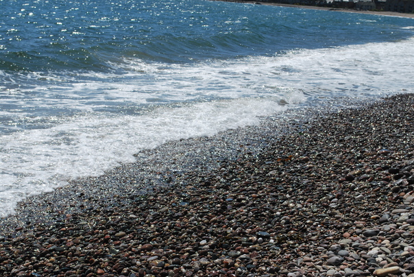 The ocean waves wash upon a rocky shore and slowly drift away.