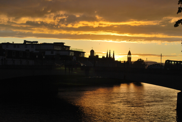 The sunset was reflected not only in the windows of the buildings, but also in the lake.