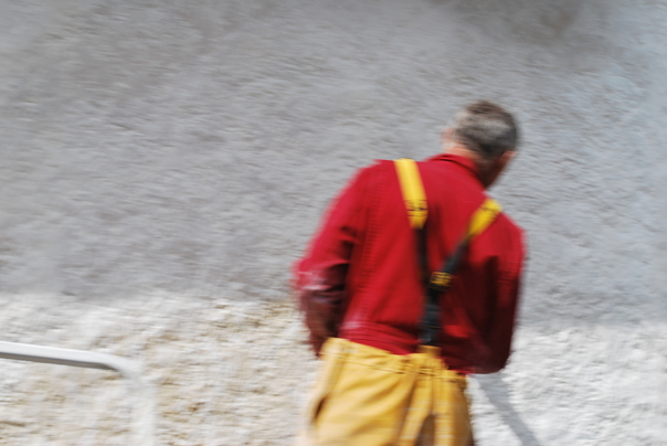 The back of a man wearing a bright red shirt with yellow suspenders and yellow pants.