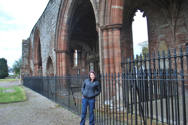 A young woman in jeans, black jacket and a pink hat stands smiling in front of a wrought iron fence surrounding the stone arches of an old church.