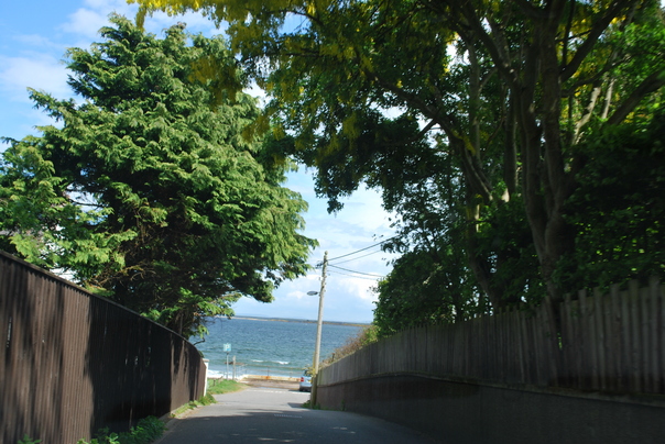 A partially shaded road leads to the ocean with fences and mature trees on both sides.