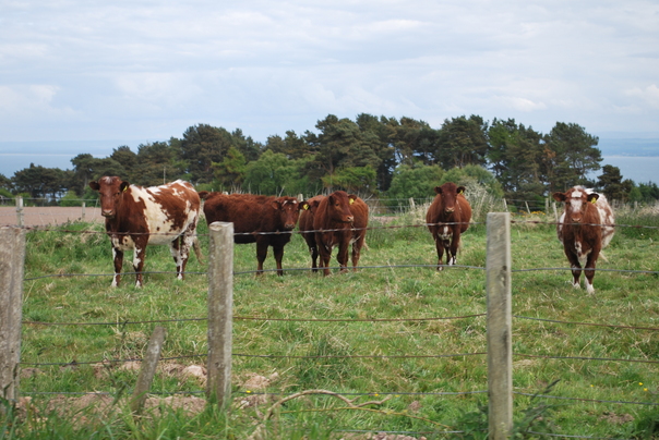 A half a dozen reddish brown and white cows are gathered in a pasture behind a barbed wire fence.