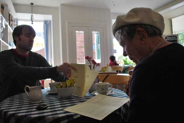 Two men are drinking coffee and reading the menu at a bright sunny restaurant, one of the men wears a white beret.