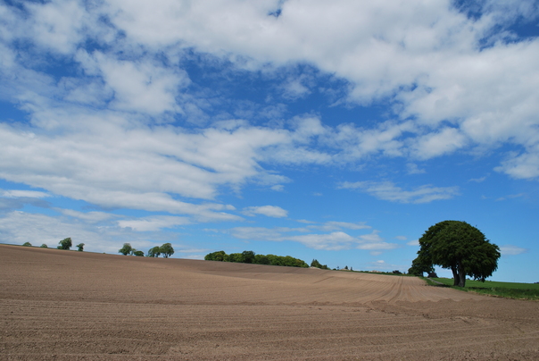 This is a picture of a sandy hill. To the right of the hill is a grassy field with trees and it looks like just beyond the hill there are a lot more trees. The sky is very bright blue with just a few wispy clouds.