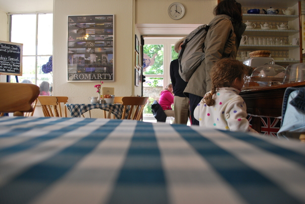This looks to be a scene from a restaurant that has blue checkerboard table clothes.