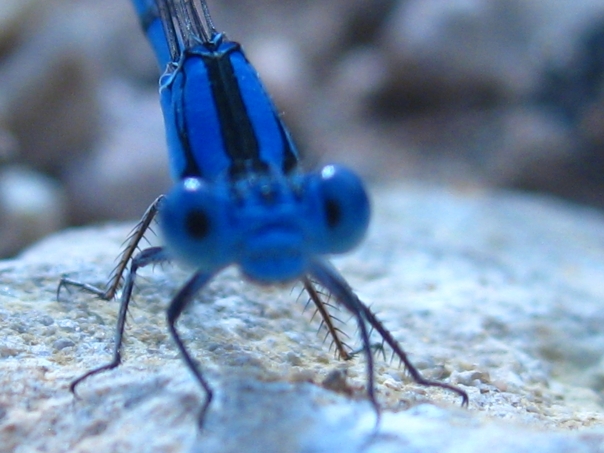 A beautiful blue insect with furry legs standing on some sort of abstract rock. |