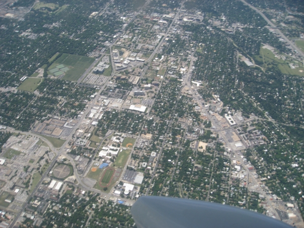 An aerial view of an urban area, with the wingtip of a plane visible in the bottom right corner. |