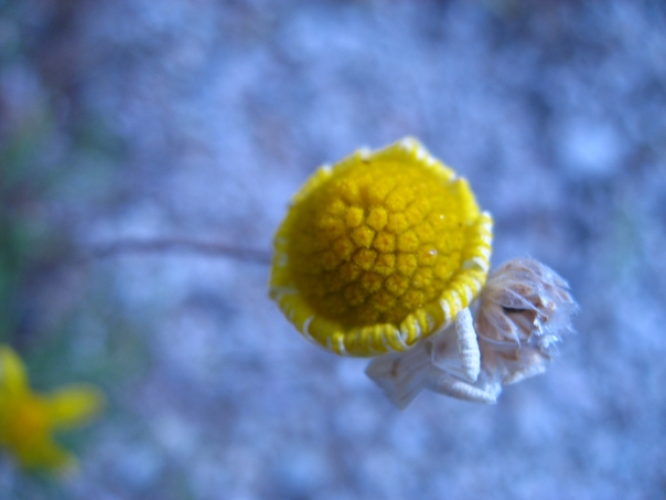 Yellow and pink flower blooming next to a well manicured lawn. |
