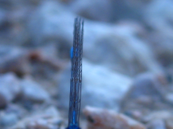 Strange looking blue and brown plant growing out of the ground next to rocks. |