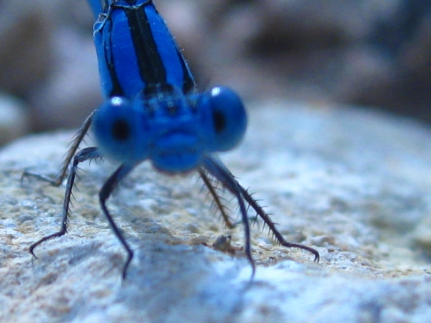 This a close up picture of a blue bug on the ground. |