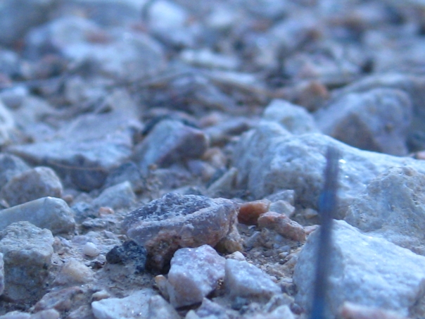 The narrow tail of a blue animal is blurred against a pile of white and brown glistening rocks. |
