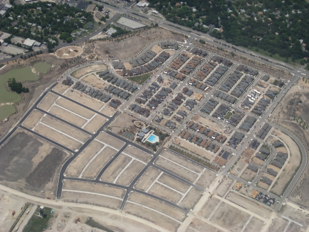 A birds-eye view of a half-constructed neighborhood with many empty, dry looking lots. |
