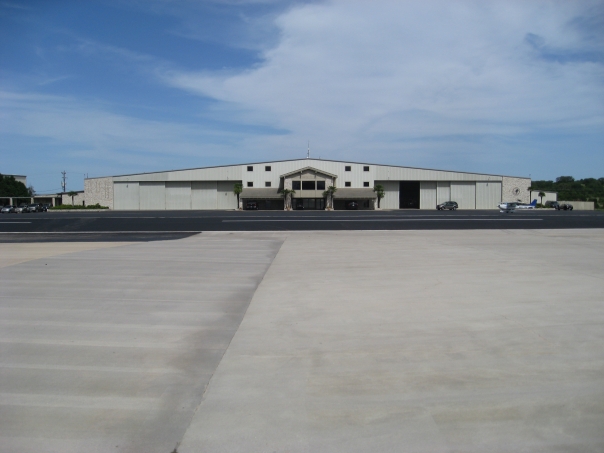 There is a large building that papers to be an airplane hangar. |