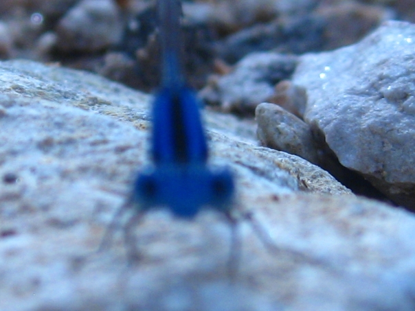 The blue bug sat on top of the hard rocks during the brightest part of the morning. |