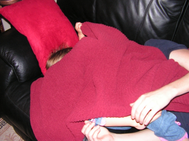 on a sofa, a young person hides under a red blanket ,and is held by an adult.