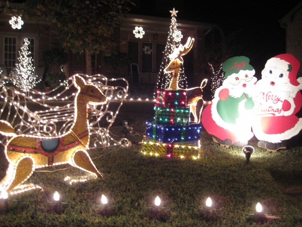 The lawn of this house is elaborately decorated with Christmas lights and cutouts.