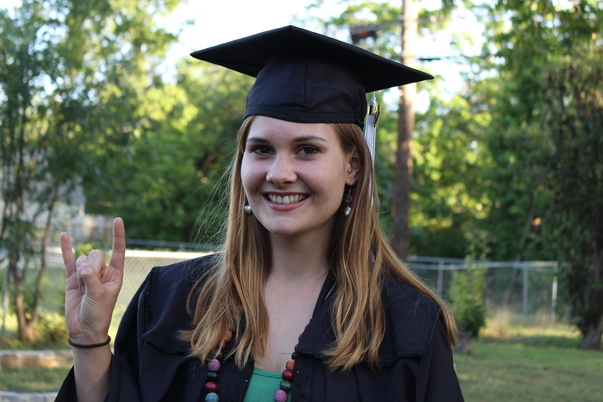 A young girl wearing a black cap and gown giving a rock on with her hand.