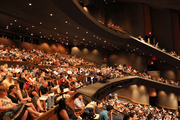 There are many people gathered together in an auditorium holding white paper pamphlets.