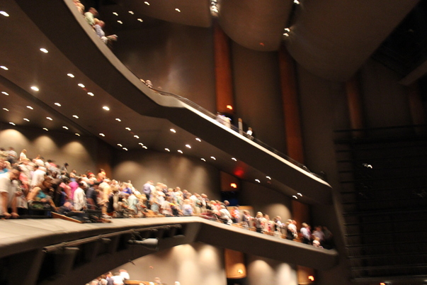 This is a picture of rows of people in an auditorium who are standing in their seats.