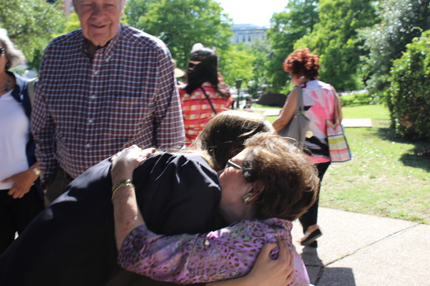Two women are hugging in front of several other people.