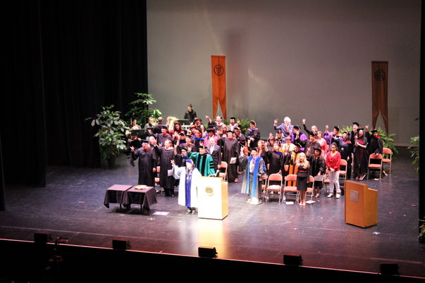 It's a graduation with students standing wearing caps and gowns and raising their hands on a stage. There is a bright light at the podium.