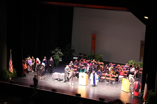 A convocation ceremony where some graduates are seated behind a student receiving something from a black robed man.