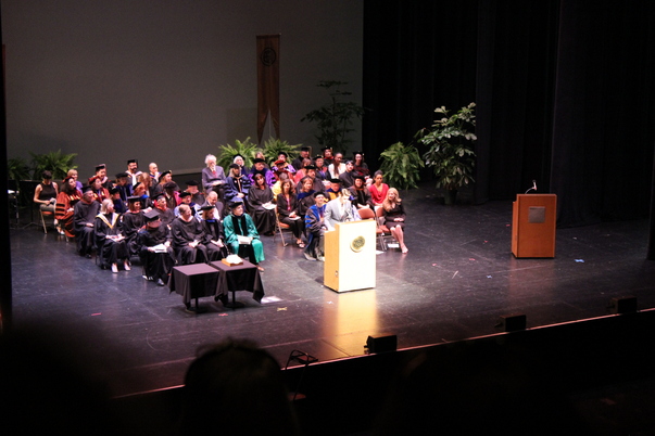 A speaker presents to the audience at a graduation ceremony.