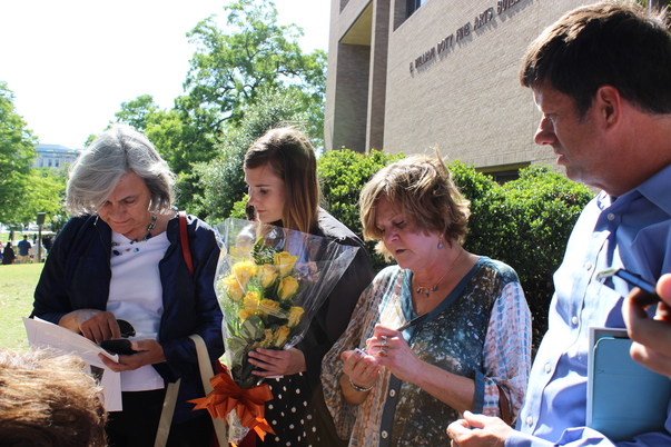 A young woman holds a bouquet of flowers while adults around her consult cell phones or take notes.