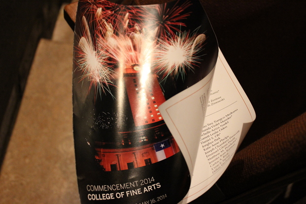 A commencement booklet for the College of Fine Arts, from 2014 with pictures of fireworks on the cover.