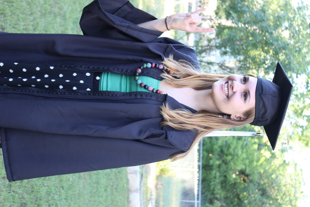 The happy graduate flashes her killer smile and the traditional peace hand sign.