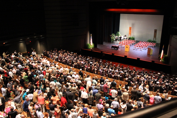 A crowd of people gather at an auditorium for a graduation ceremony.