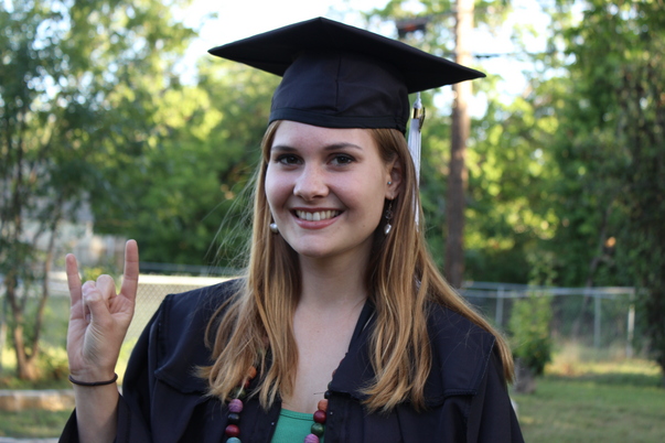 A college graduate in cap and gown gives the long horn hand gesture.