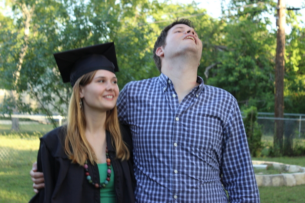 A picture of a boy standing next to a girl graduating from school.