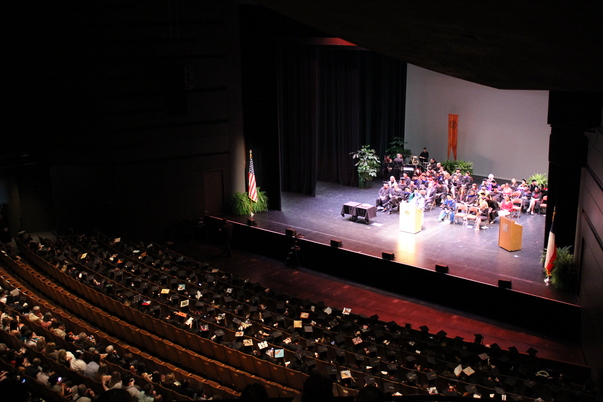 An over head shot of a college graduation ceremony in a huge auditorium.