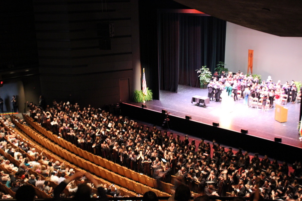 THE AUDITORIUM BELLOWS THE PROUD SPORADIC CHEERS OF THE GRADUATES AND THEIR PARENTS.
