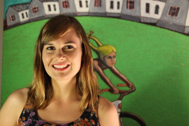 This woman smiles in front of a painting of a girl riding her bicycle on green grass in front of a row of houses.