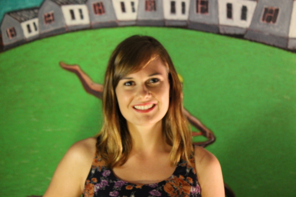 A woman with dark blondish brown hair stands and smiles in front of a painting showing bright green grass with white houses in a row.