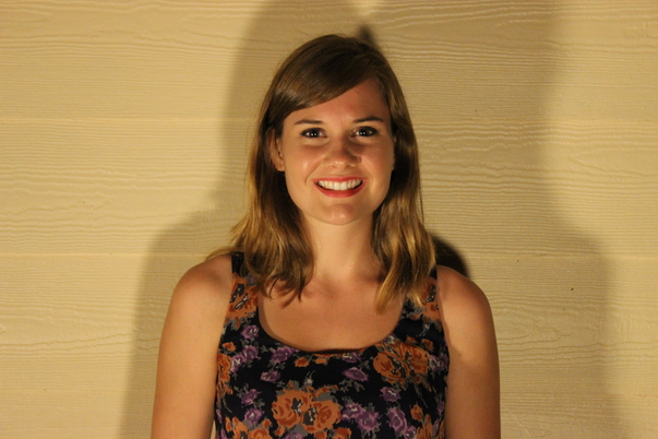 A blonde woman with a floral shirt is standing against a light brown wooden wall.