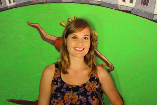 A pretty girl with long brown hair is wearing a flower dress is standing in front or a painting of a person on a green background.
