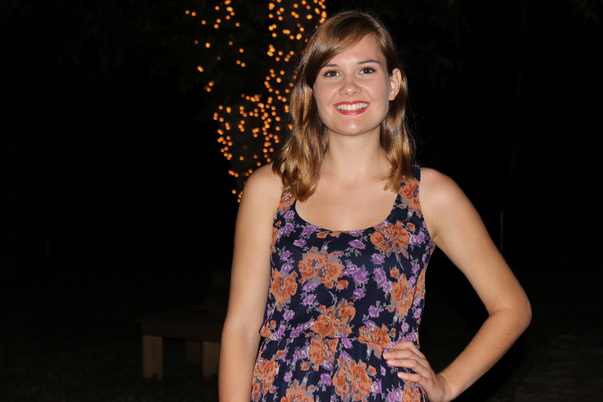 This woman is wearing a blue and floral dress and is standing in front of lights.