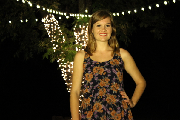 This is a picture of a lady with a flower dress on standing in front of some lights.