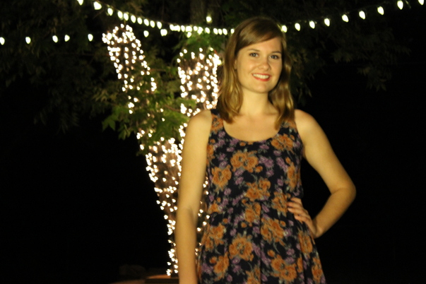 A young woman in a flower print dress with a smile on her face.