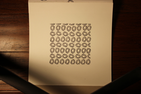 A sketched picture of a bunch of ovals laying on a wooden desk.