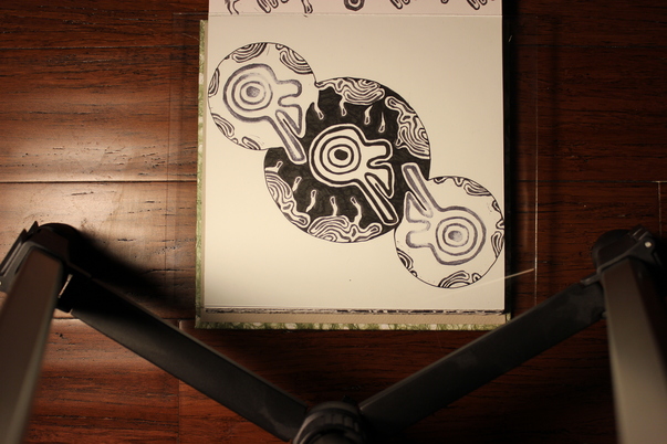 Sitting atop a wood grain surface, an ink sketch in black and white with three intersecting circular shapes, the middle circle is mostly black while the outer circles are primarily white.