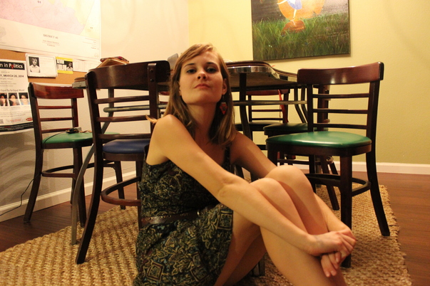 A young woman in a green dress sitting on the floor of a room.