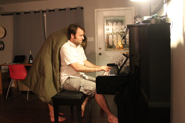 A casual pianist practicing some tunes in the comfort of his home. His significant other is comforting him while she enjoys the medley.