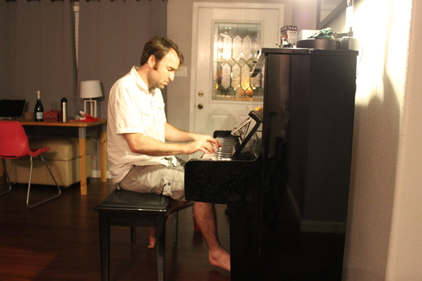 A man with no shoes is playing a black piano while wearing a white shirt.